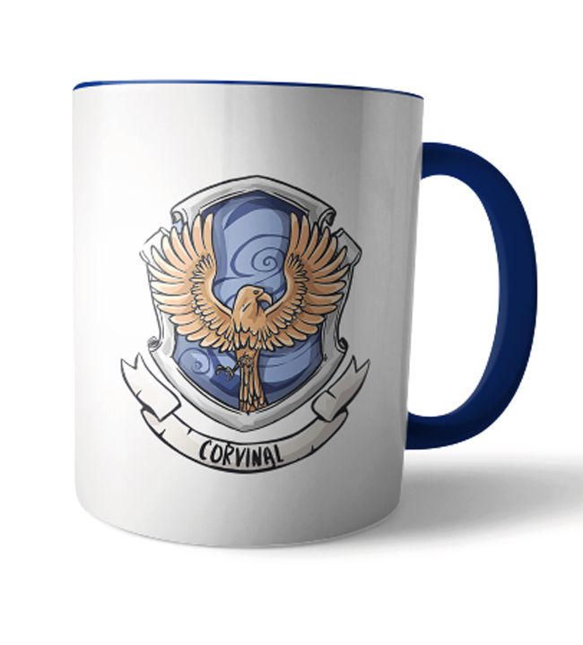 As canecas da NerdHouse são exclusivas e esse modelo da caneca tem o interior e alça Azul Escura, com a estampa das escolas de bruxos mais amada nos livros e filmes Corvinal.